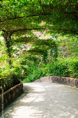 Beautiful flower tunnel road concrete pathway under blossom colorful bougainvillea ornamental vines at ecotourism local community in Can Tho, Vietnam, conservation minimize environmental impact