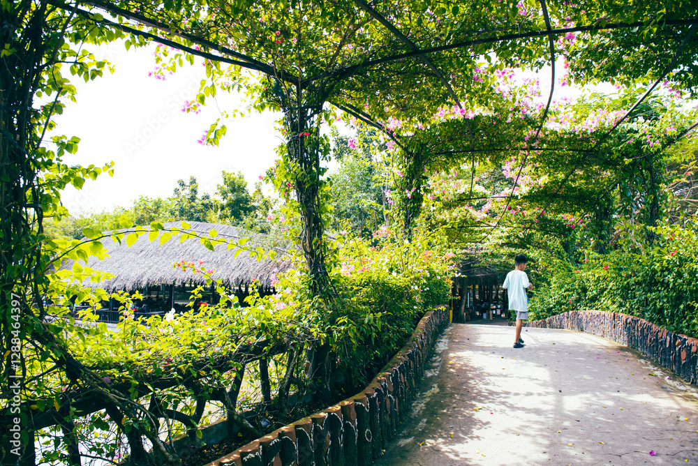 Unidentified Asian toddler boy walking along flower tunnel road concrete pathway under blossom colorful bougainvillea ornamental vines at ecotourism local community in Can Tho, Vietnam, travel