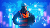 Man international logistics specialist. Global supply chains. Man with cardboard box near world map. Charts of growth and decline of imports. Portrait of logistics specialist in orange vest