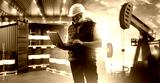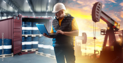 Portrait of man oil worker. Guy with laptop near barrels of petrol. Crude oil fields at sunset. Specialist from fuel industry. Manager of petroleum producing company. Oil man in white helmet