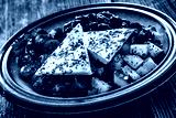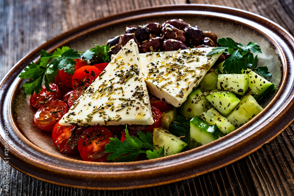 Greek style salad - fresh vegetables with feta cheese, kalamata olives on wooden table