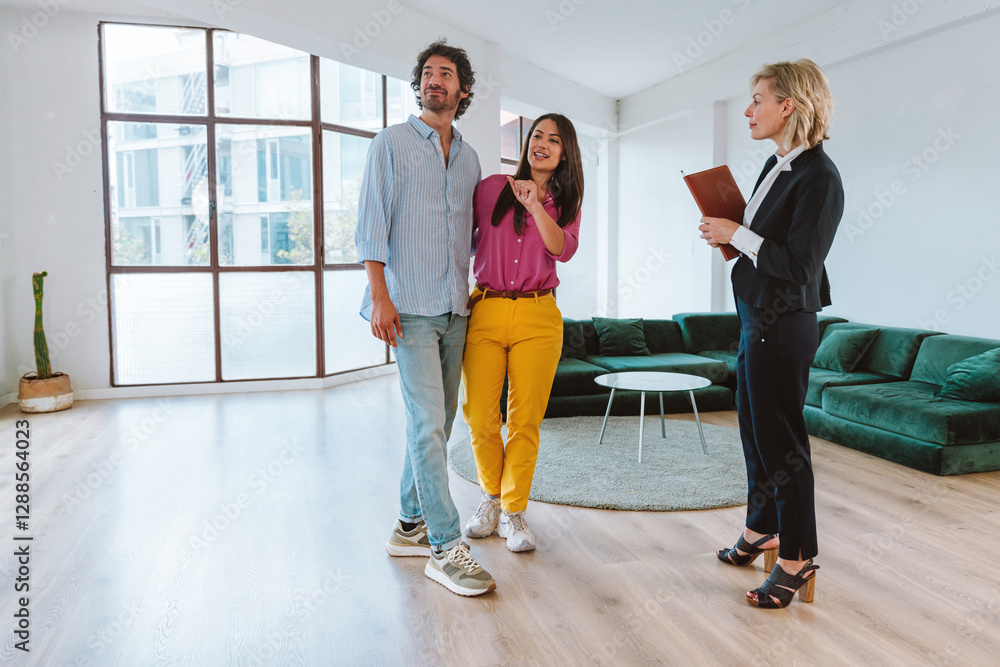 Real estate agent showing a new apartment and features of a good investment to a young couple. Woman and man buying a property in a rich area of the city.