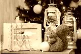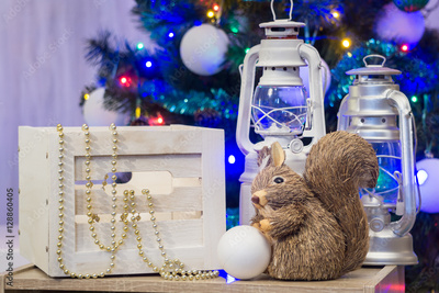 Christmas decorated interior with Christmas Tree, lamps and gift