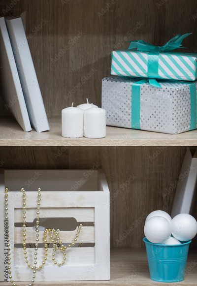 Christmas decorated interior with Christmas Tree, lamps and gift