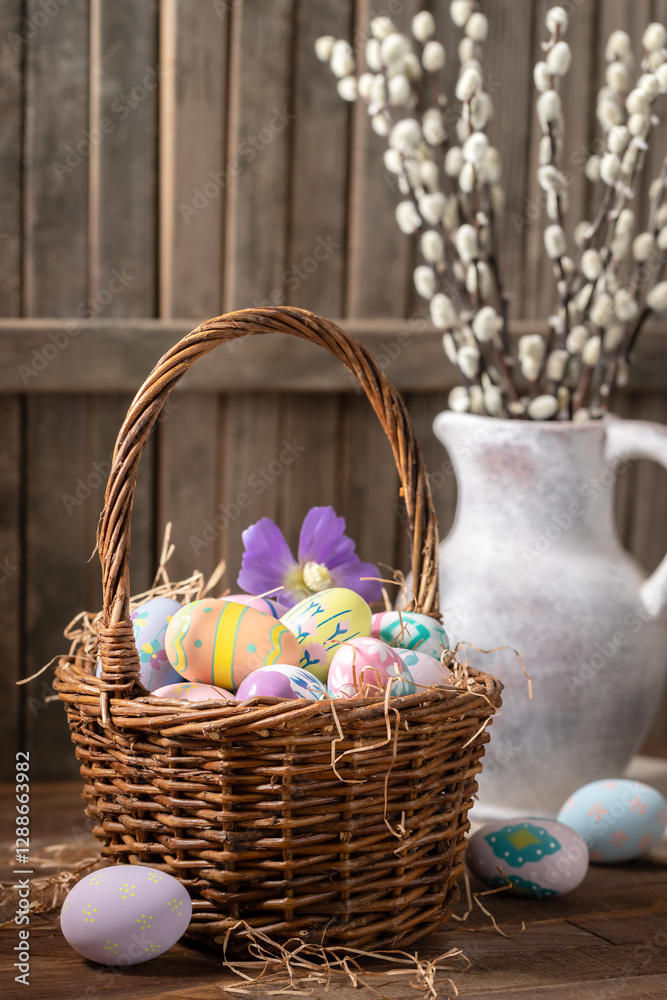 Decorated Easter eggs in a basket and vase with pussy willow branches