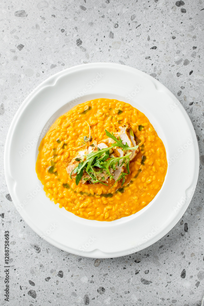 A delicious plate of creamy pumpkin risotto topped with grilled chicken and fresh arugula. The vibrant orange color and textures create an inviting culinary experience