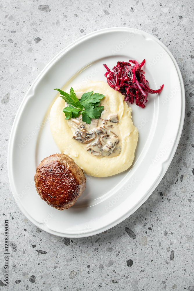 A delicious plate featuring creamy mashed potatoes topped with mushroom sauce, a juicy meat patty, and a side of vibrant red beet salad, garnished with fresh parsley.