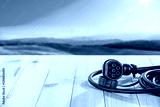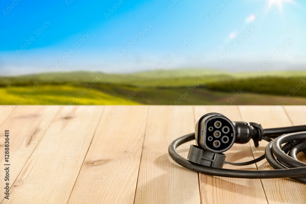 Black electric car charger on a wooden table against the background background of green field and blue sky. Ecological and practical charging.