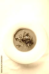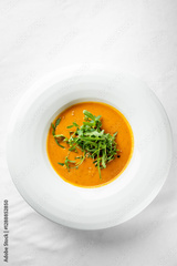 A bowl of vibrant orange soup garnished with fresh arugula. The creamy texture and rich color make it an appetizing dish, perfect for a gourmet dining experience.