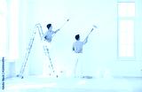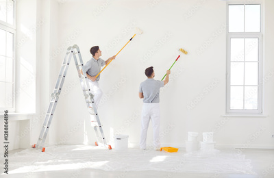 Professional team of man painters working together to paint a wall using roller brush during a renovation in a home or office. Collaborative effort and skill in construction and renovation work.