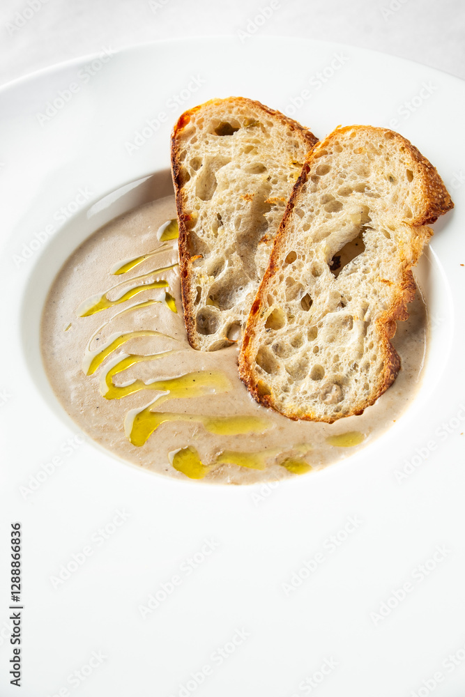 A stylish presentation of creamy soup in a white bowl, garnished with olive oil drizzle and accompanied by two slices of toasted bread. Ideal for a gourmet dining experience.
