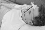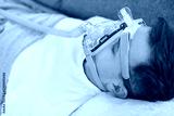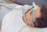 Close up shot of a Caucasian man is lying on a sofa at home, breathing through an oxygen mask. This medical equipment helping him with treatment for asthma or other respiratory diseases.