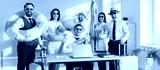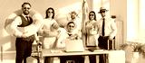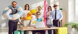 Happy business team ready for their summer vacation together. Group of cheerful, smiling coworkers with holiday bags, funny beach toys, sun hats and sunglasses by desk in office workplace