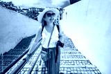 Beautiful mature woman tourist with camera walking up stairs and sightseeing old town of Tavira in Portugal on sunny summer day. Visit nice portuguese town. Front view