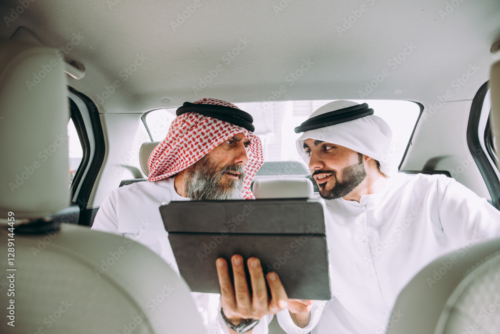 Senior and young arabian men wearing kandura traditional dress from uae in Dubai. Speaking about business plans