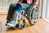 Detail or woman in a wheelchair with leg brace after sport injury