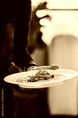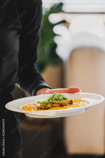 A waiter serves a plate of gourmet food featuring a vibrant orange sauce, garnished with fresh herbs. The background is softly blurred, highlighting the dish.
