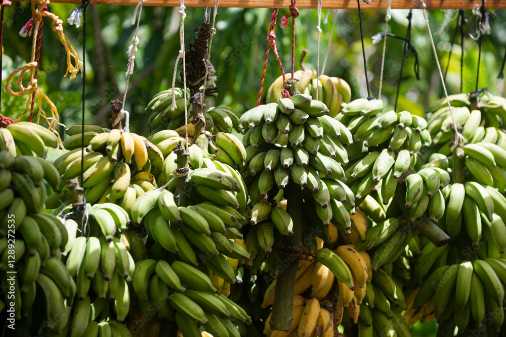 Organic banana plant background. Fresh tropical banana. Nature banana background. Tropical banana tree leaves. Exotic jungle greenery. Lush green foliage in nature. Organic tropical plants.