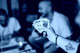 Close-up of a hand holding playing cards, while a group of friends enjoys a card game in the background, fostering connection and relaxation.