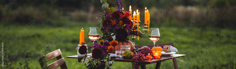 Banner. Garden romantic party outside with wine, cheese, fruits. Field or meadow, family event, cozy autumn atmosphere, fall vibes. Wooden furniture, pumpkin with flowers as centrepiece, fresh dahlia