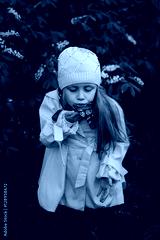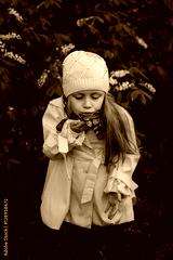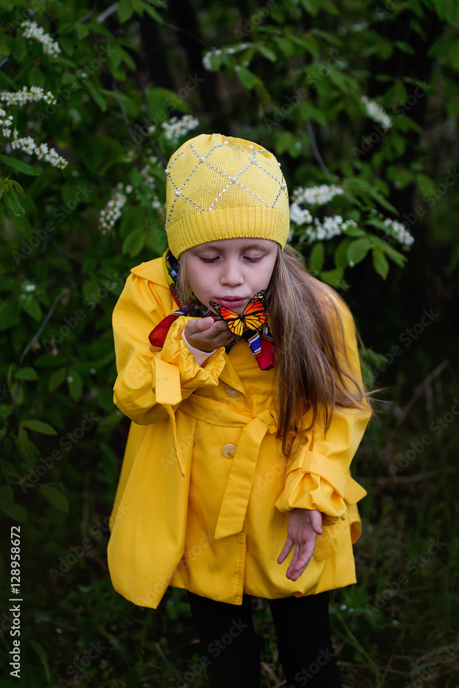 cheerful girl in a yellow raincoat blows a butterfly which sits on a hand on a spring day in the park