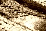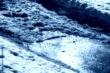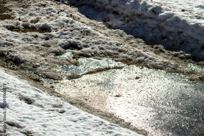 A wintertime sidewalk, wet from snowmelt runoff, reflects the sun brightly.