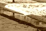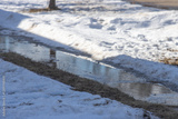 A sidewalk filled with runoff water from the melting snow on a warm day in the wintertime.