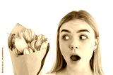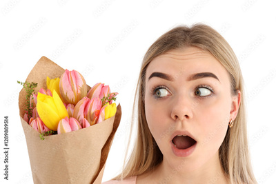 PNG, March 8. Girl with a bouquet of tulips, close-up, isolated on a white background.