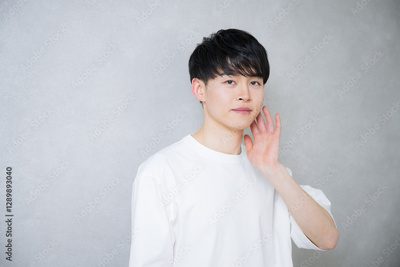 頬に手を触れてカメラ目線の若い20代の男性 美容やビューティーイメージ