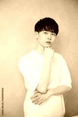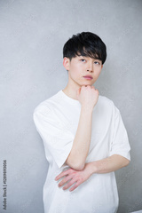 顎に手を当て若い20代の男性 美容やビューティーイメージ 真面目で真剣な表情