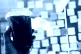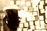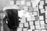 Close up man hand holding a plastic glass iced black coffee with many post it notes background in the office