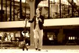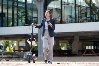 Young businesswoman is walking with her electric scooter and using smartphone in front of modern office building, embracing sustainable and efficient commuting
