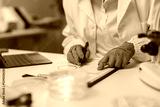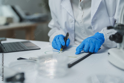 Scientist wearing blue gloves analyzing medical research data on a computer, pointing at detailed charts in a well-equipped laboratory setting, showcasing precision and expertise in the field