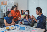 Asian software developers team testing virtual reality application in modern office, woman wearing vr headset interacting with virtual reality world, colleagues looking and giving advice
