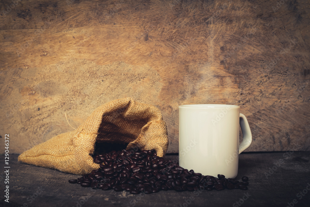 Cup of coffee sacks of coffee beans on the old wooden floor. Vin