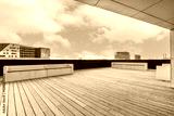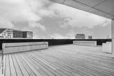 Spacious rooftop terrace featuring wooden flooring and sleek furniture, surrounded by urban architecture under a blue sky. ideal for relaxation and events.