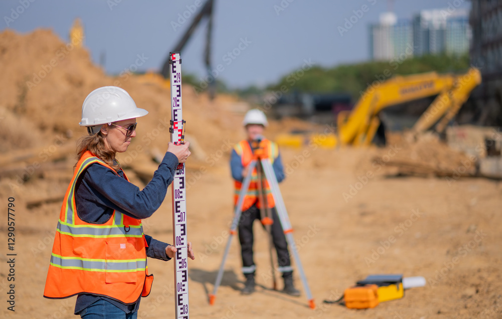 Construction surveyor or engineer working construction site leveling rod and theodolite mounted tripod measuring angles and distances with heavy machinery excavator constructed hi-way road background.