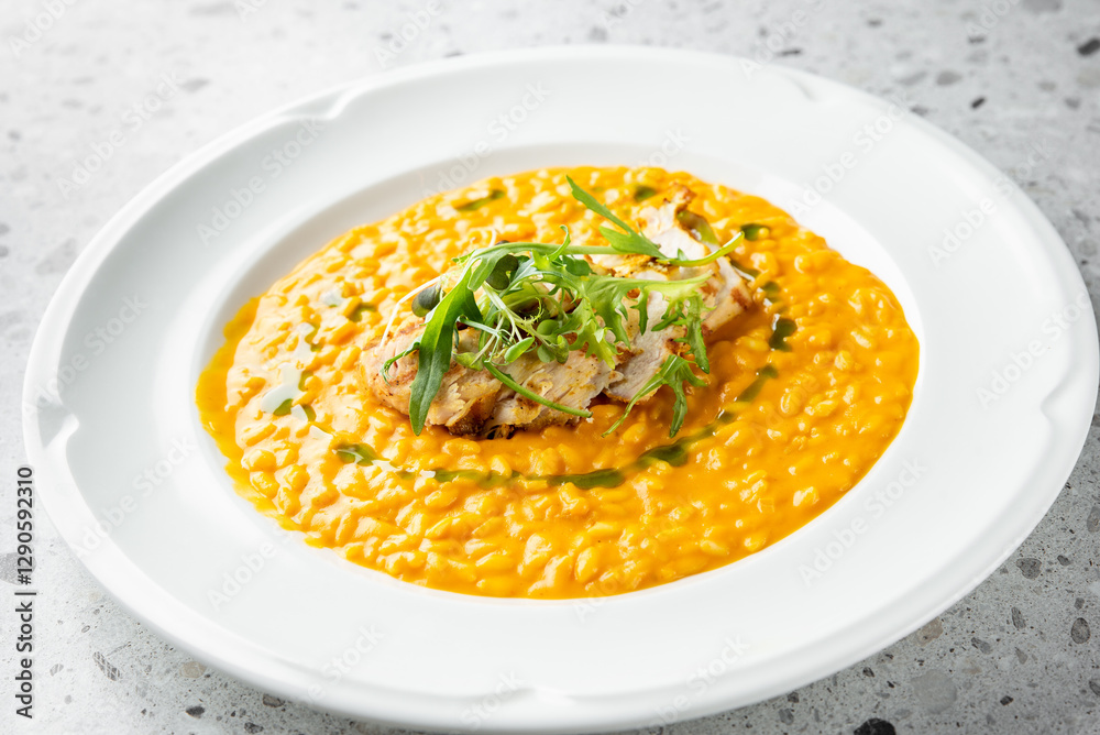 A beautifully plated dish featuring creamy risotto with saffron, garnished with green herbs and topped with a slice of grilled chicken on a white plate.