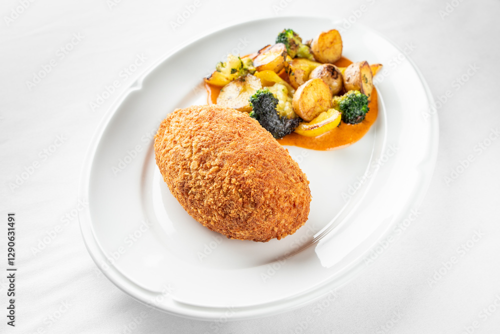 A delicious serving of golden-brown croquette on a white plate, accompanied by vibrant roasted vegetables including potatoes, broccoli, and a rich sauce.