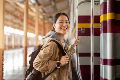 The smiling beautiful asian woman with bag is entering the carriage at the train station.