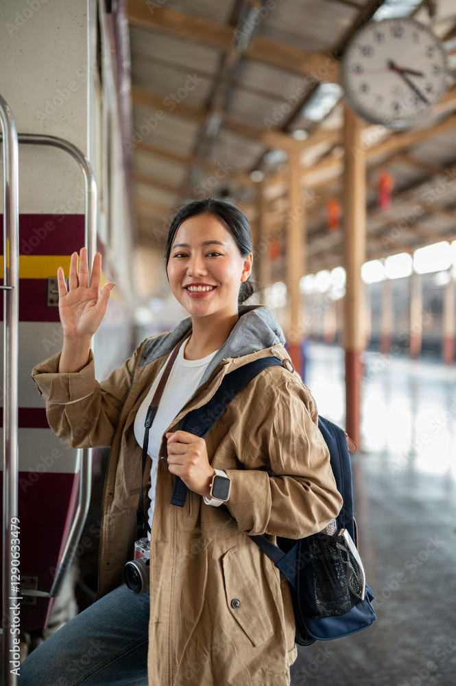 Smiling asian woman with bag is waving her hand before entering the carriage at the train station.