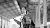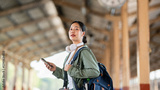 An asian woman is looking around while holding phone, standing in train station or railway station.
