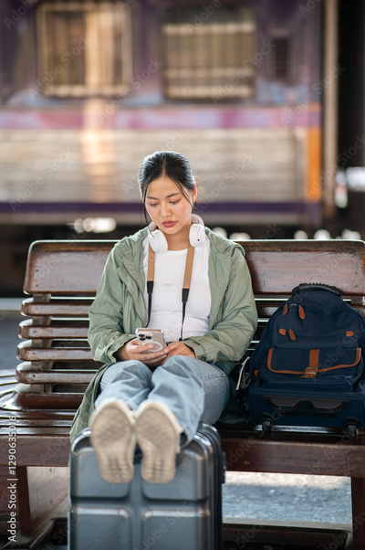 An asian woman is looking at her phone, sitting alone with her bag and luggage in the train station.
