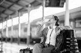 An asian woman is drinking the water while sitting alone with bag and luggage in the train station.