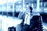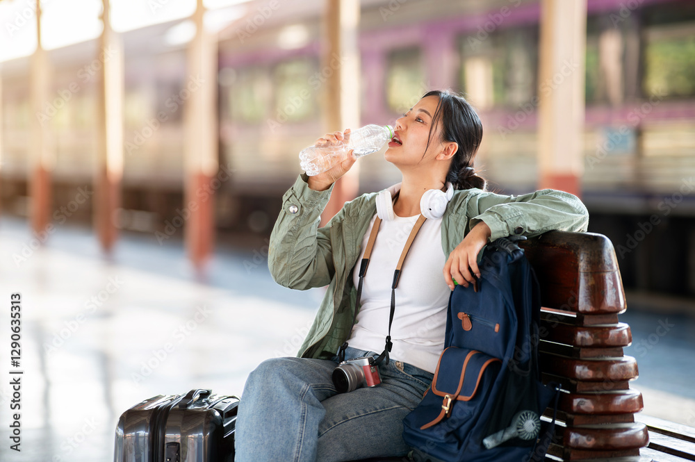 An asian woman is drinking the water while sitting cross legged on the bench in the train station.
