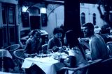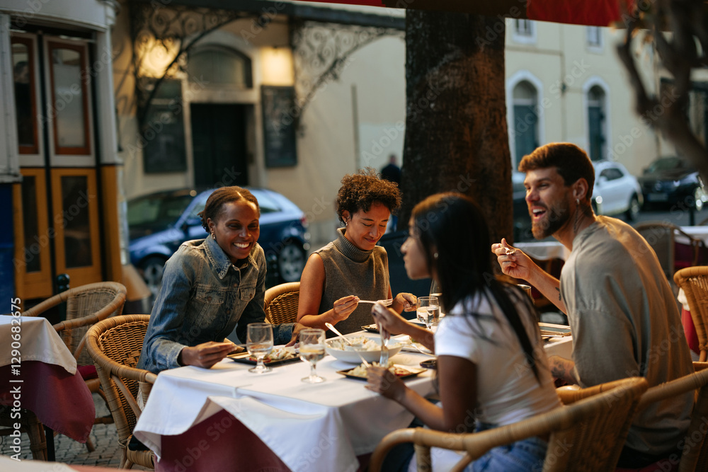 Friends enjoying dinner together at outdoor restaurant in Lisbon