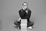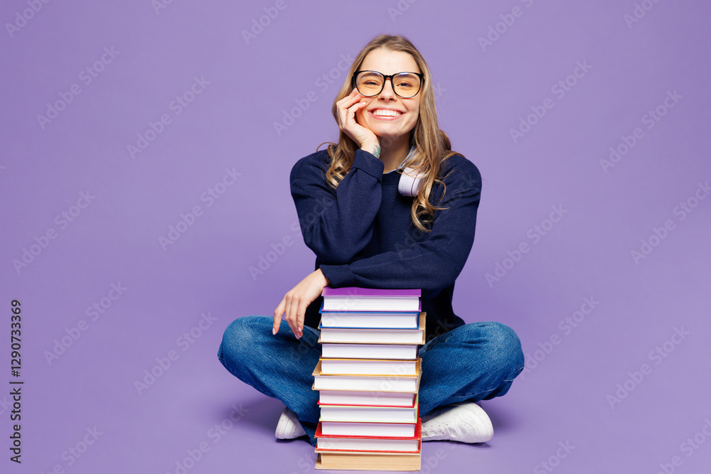 Full body young happy girl student wear blue casual clothes glasses headphones sitting hold stack of books look camera isolated on plain light purple background High school university college concept