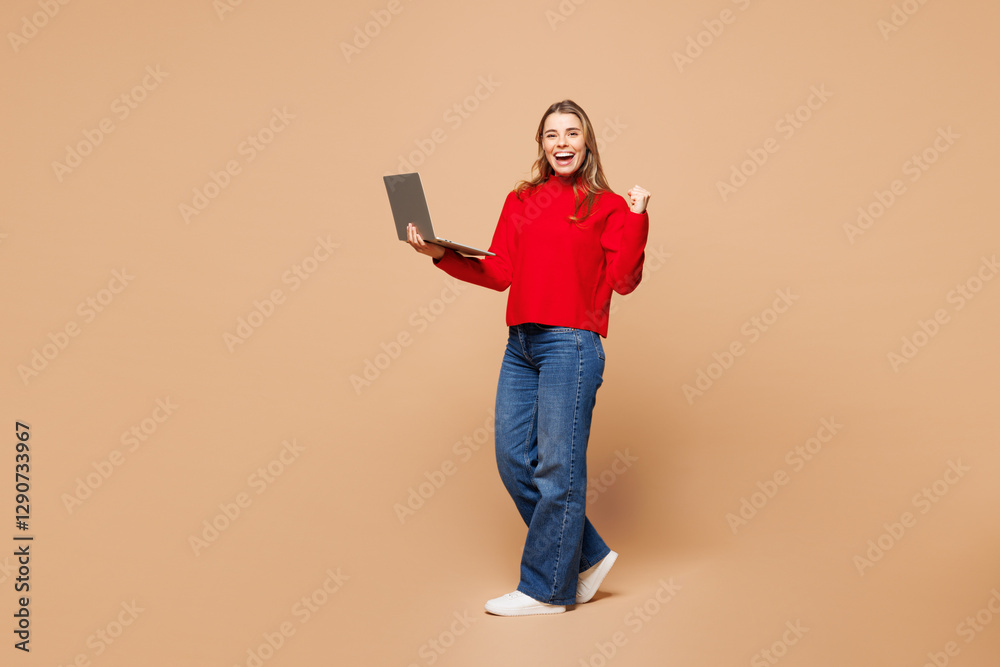 Full body young Caucasian IT woman she wear red casual clothes hold use work on laptop pc computer do winner gesture isolated on plain pastel light beige background studio portrait. Lifestyle concept.