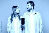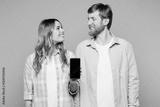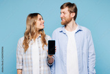 Young couple two friends family man woman wearing shirt casual clothes together hold use mobile cell phone with blank screen workspace area look to each other isolated on plain blue background studio.