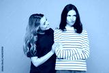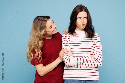Young sad mad offended couple two friends women they wear red casual clothes together try to make up apologize isolated on pastel plain light blue cyan background studio portrait. Lifestyle concept.